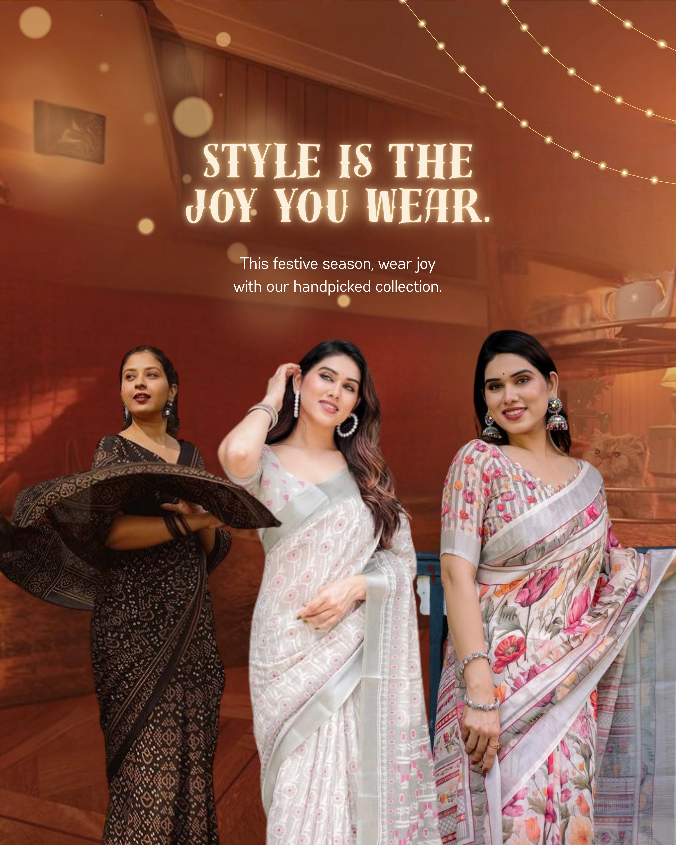 Pure Linen Sarees: Known for their lightweight feel and sophisticated appeal, Almaari’s linen sarees are perfect for women who value comfort and elegance. These sarees are enhanced with intricate digital prints and tassels, making them a versatile choice for both casual and formal occasions.