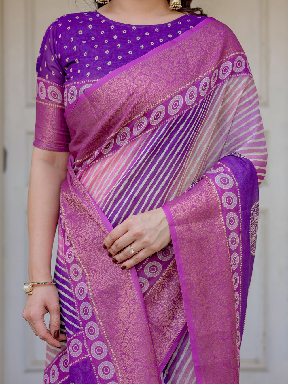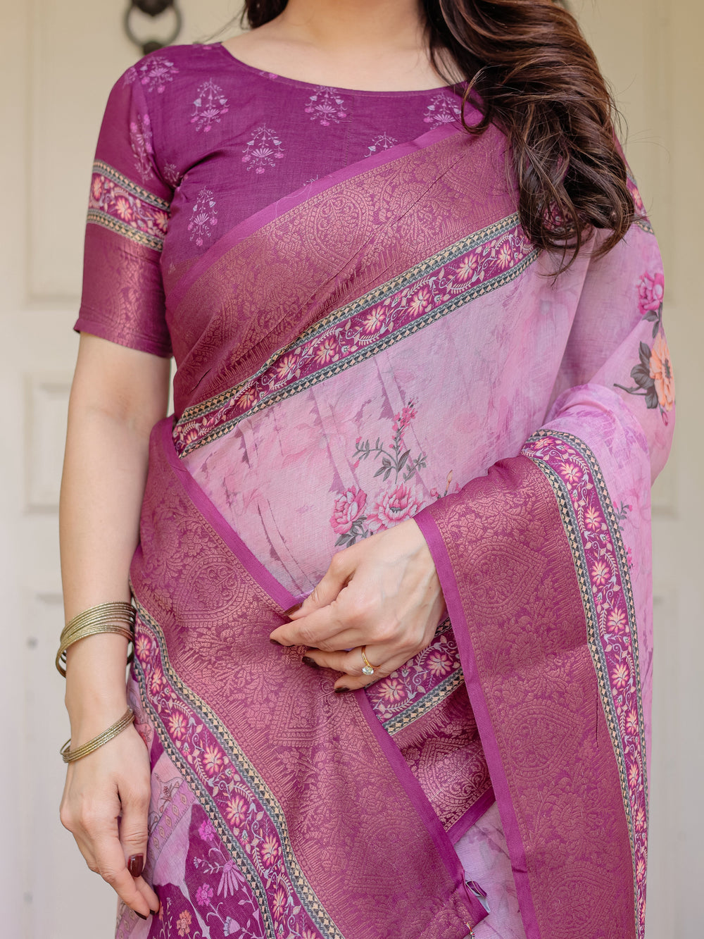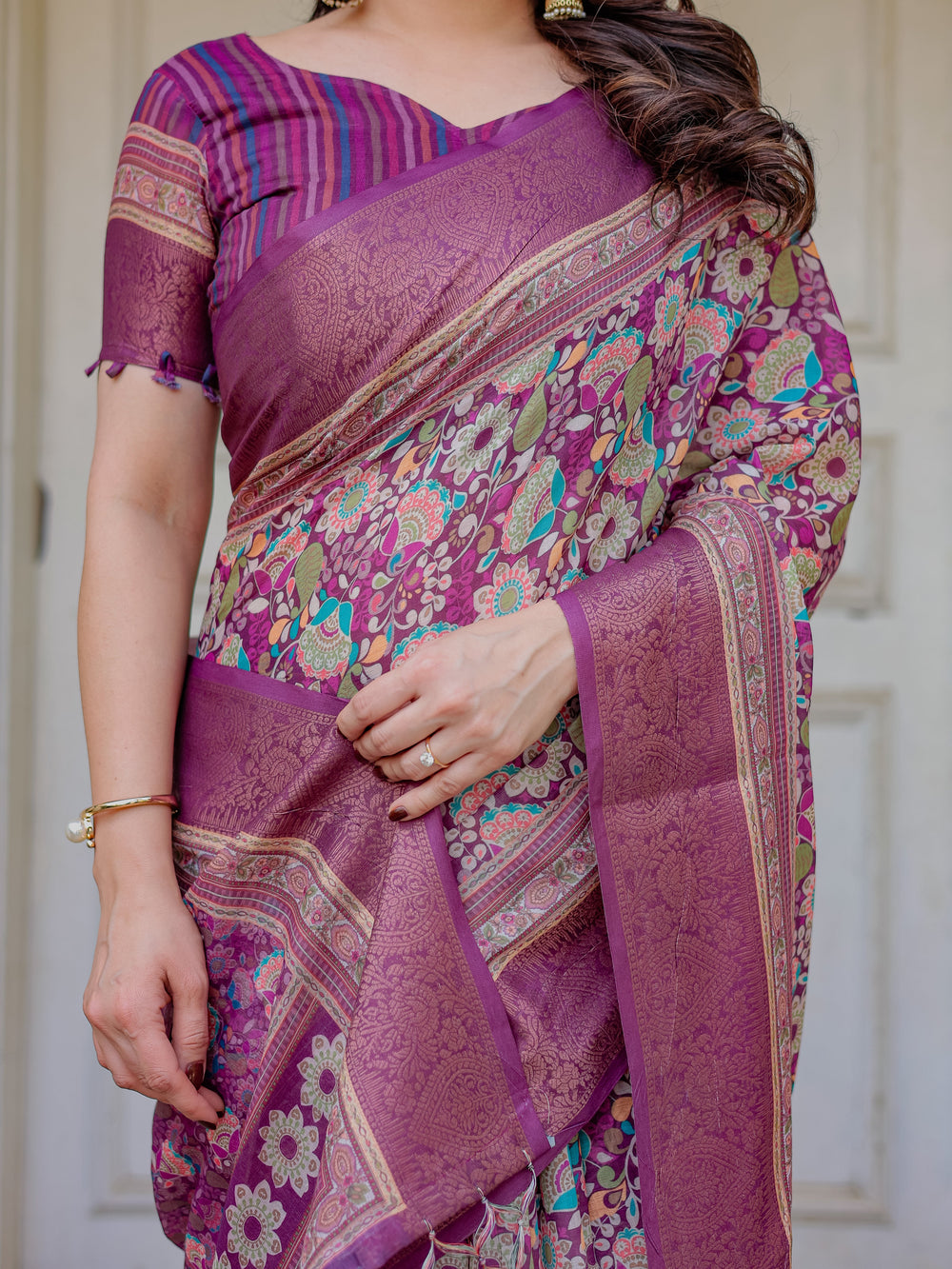 Shop the Best Handloom Linen Printed Floral Sarees with Floral Printed Blouses & Tassel-Edged Pallus – A Perfect Fusion of Comfort & Elegance