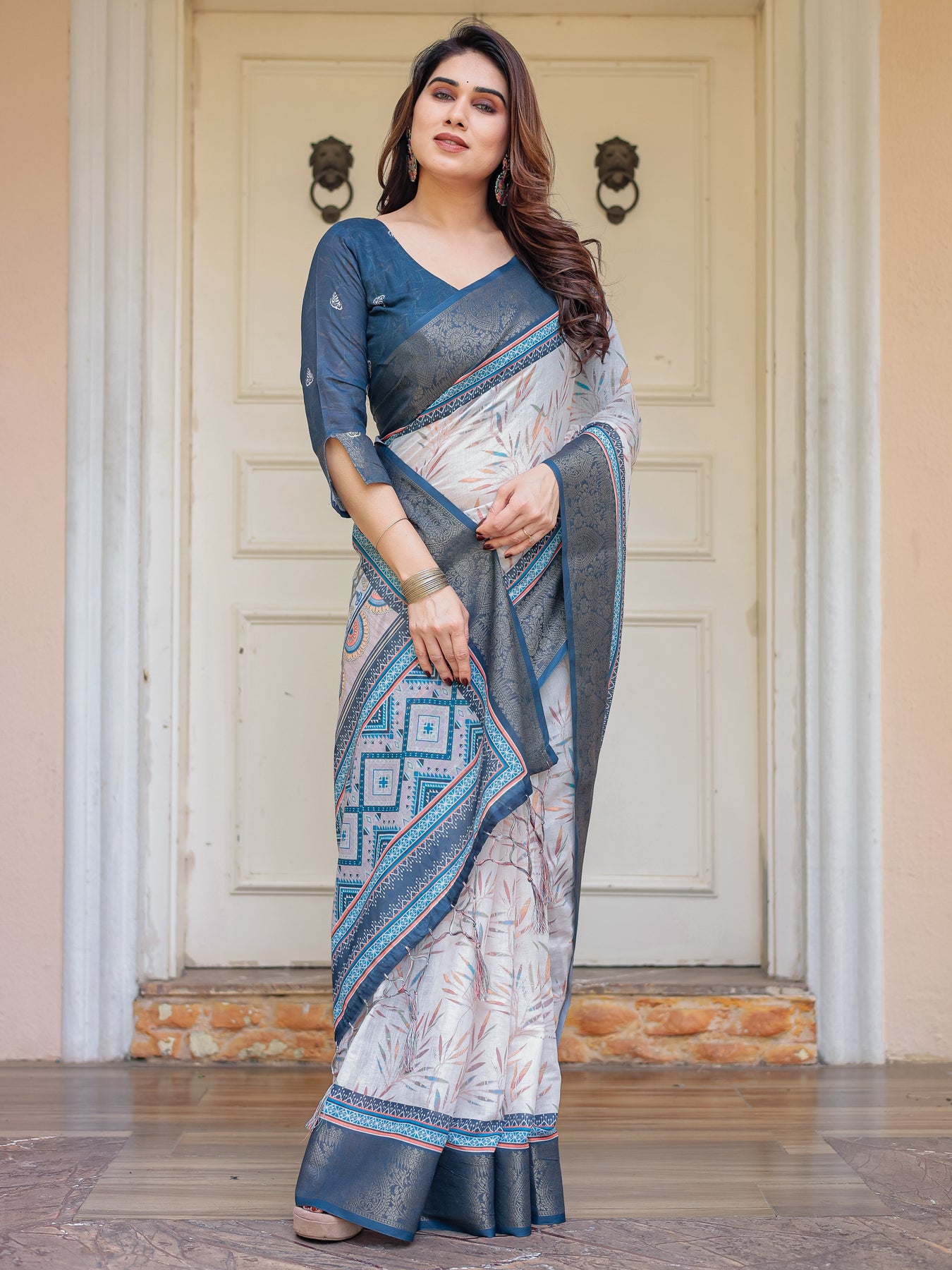 Subtle sophistication meets everyday tradition in this elegant Steel Grey Handloom Cotton Printed Saree, thoughtfully crafted for women who love calm tones with refined detailing. The saree features a soft off-white base decorated with delicate nature-inspired motifs, beautifully complemented by deep steel-grey and teal accents for a graceful contrast.
