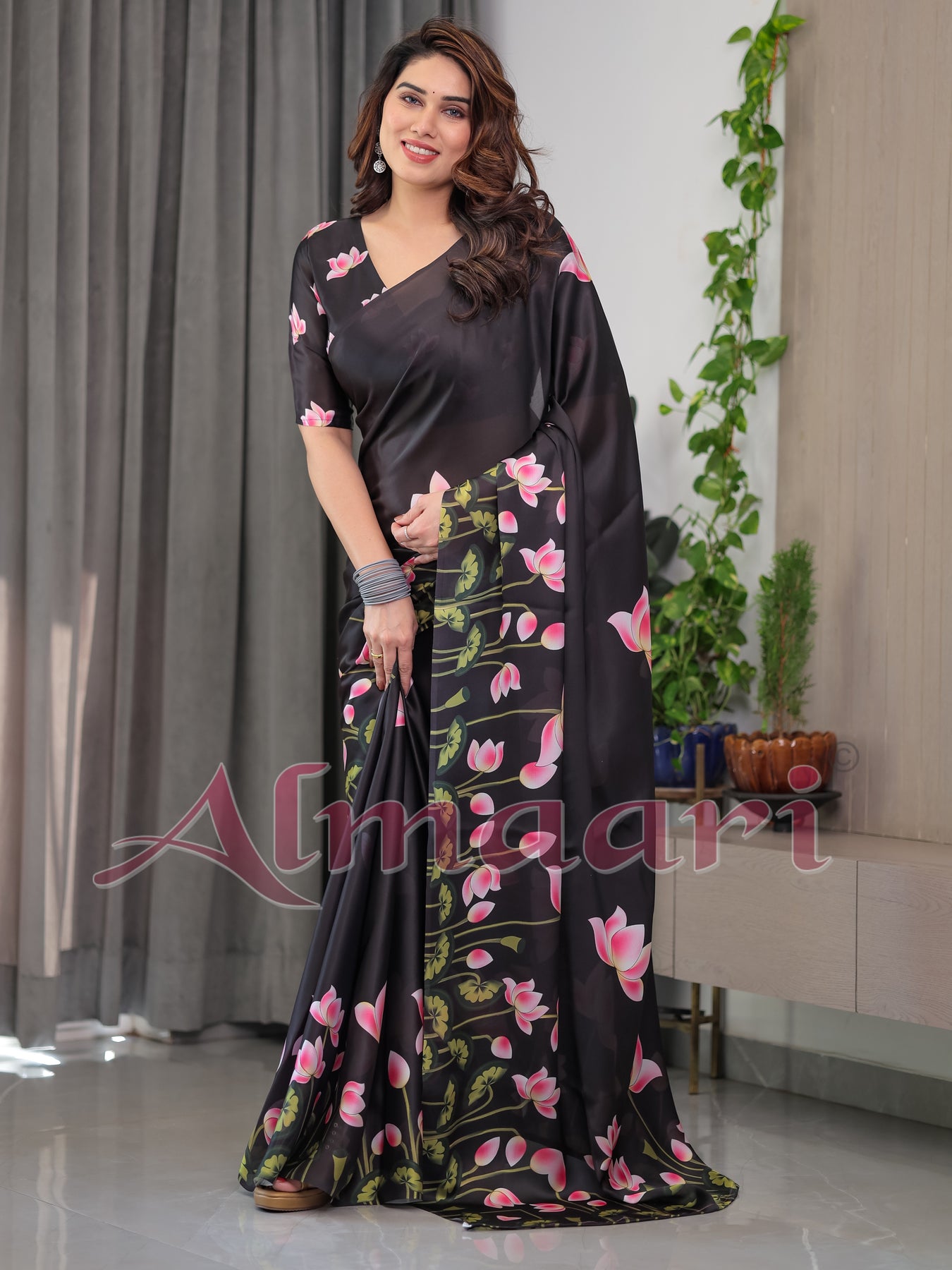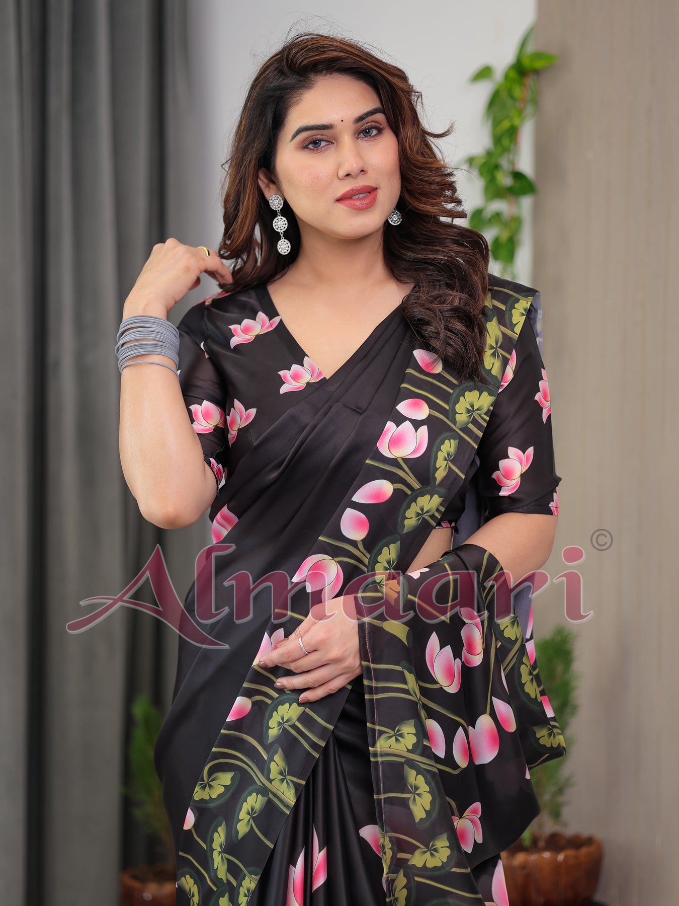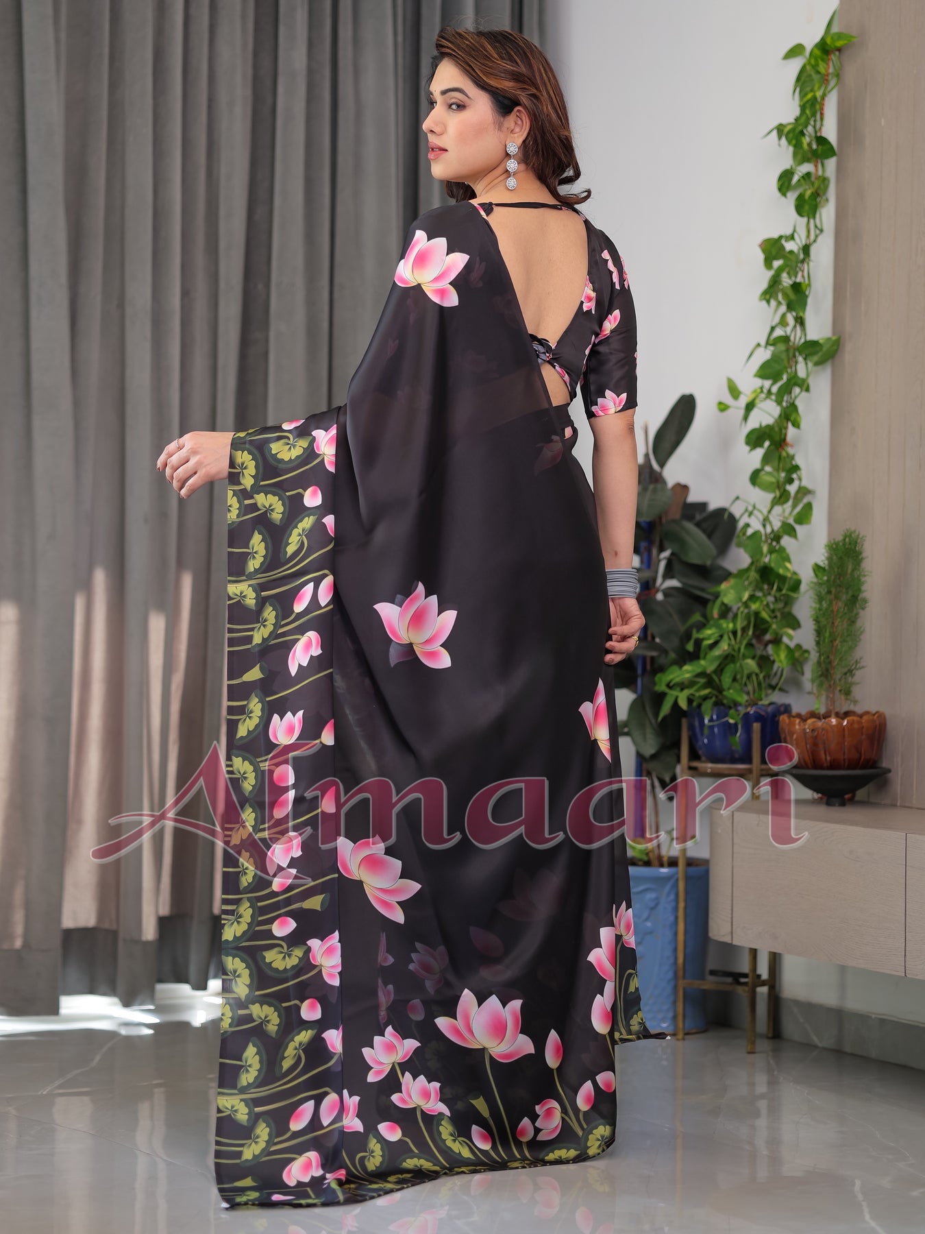 Black Satin Georgette Lotus Floral Printed Saree with Attached Blouse – Elegant Designer Saree for Festive & Evening Wear