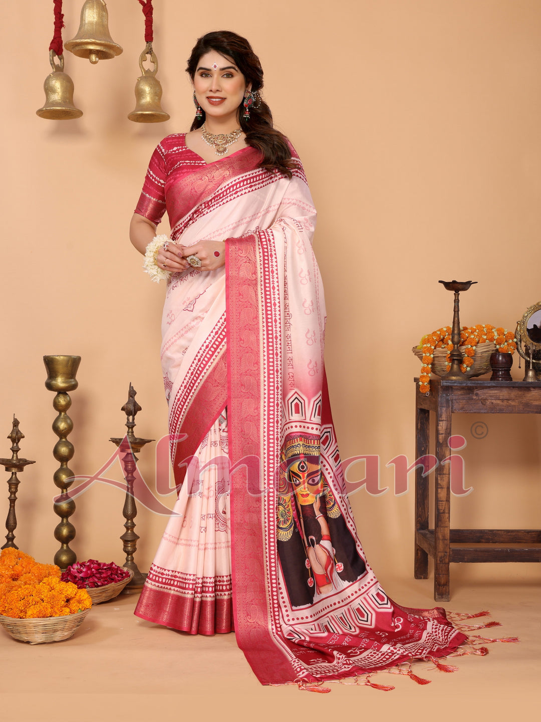 Almaari Fashion introduces a timeless collection of Handloom Linen Printed Floral Sarees, paired with floral printed blouses and tassel-edged pallus, combining the richness of handwoven fabrics with modern aesthetics. These sarees are designed for women who appreciate the beauty of handloom weaves and the convenience of contemporary styling, making them ideal for festive occasions, casual outings, and elegant office wear.