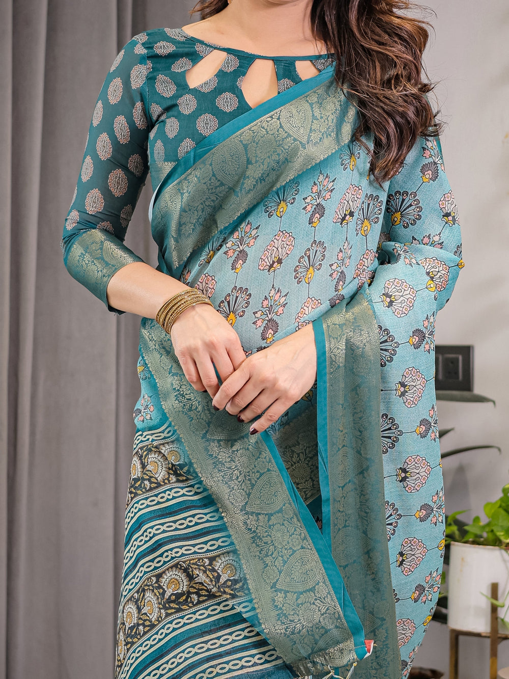 Floral Printed Blouse: Creates a contrast that enhances the beauty of the saree.