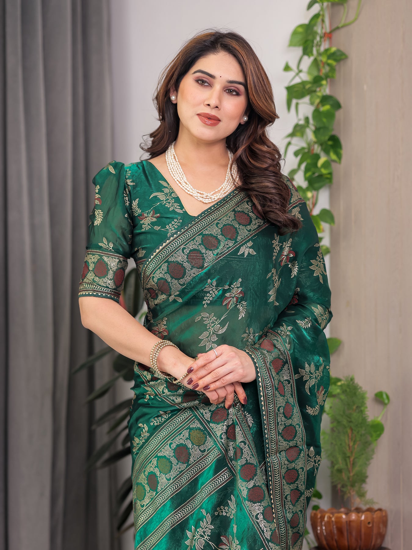 Exude timeless sophistication with this Bottle Green Fendi Satin Saree, designed for women who appreciate rich hues and refined craftsmanship. Made from premium Fendi satin fabric, this saree features traditional block prints elevated with subtle foil detailing, adding a graceful sheen to its deep green base.