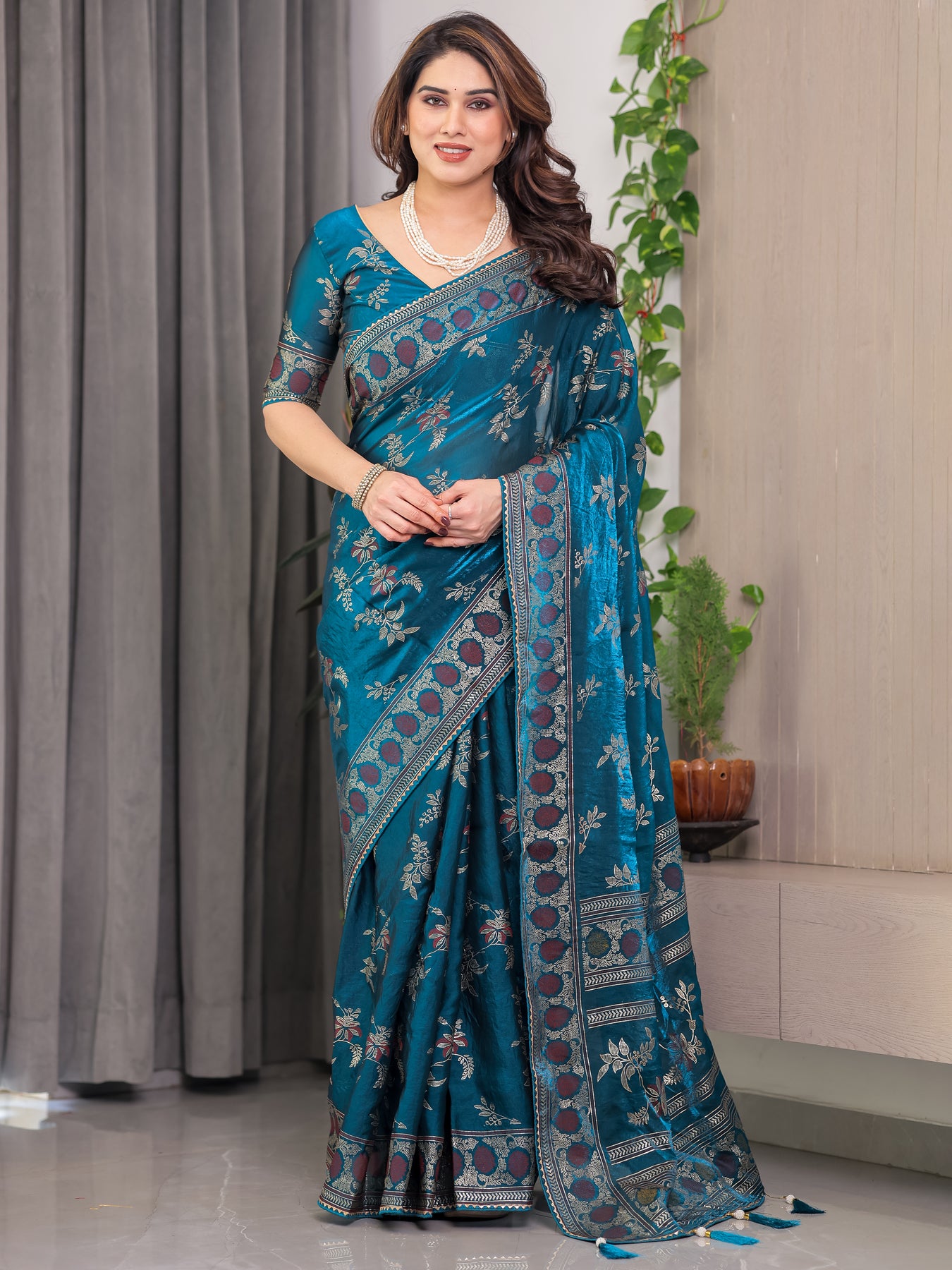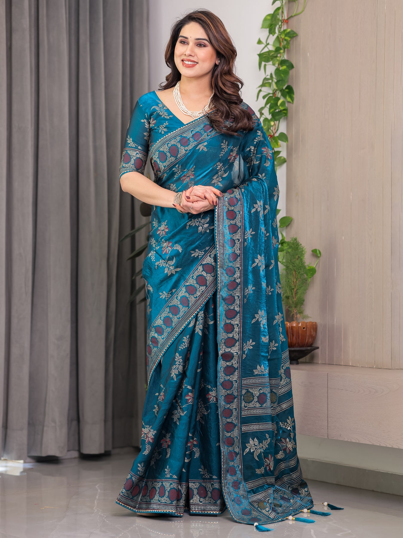 The rich teal blue base is adorned with floral and ethnic motifs, beautifully balanced with a decorative woven-style border and an artfully designed pallu. The satin texture offers a luxurious fall, enhancing the silhouette while ensuring comfort throughout the day.