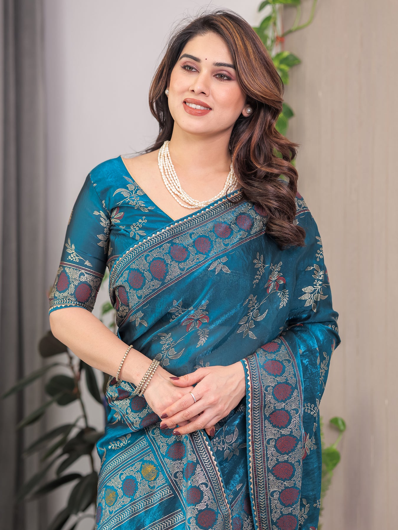 Style this teal blue saree with pearl or kundan jewellery to complement its cool-toned elegance. Opt for soft curls or a sleek low bun for a polished look. Pair it with silver or antique gold heels and keep the makeup fresh with dewy skin, kohl-lined eyes, and a muted rose or berry lipstick.