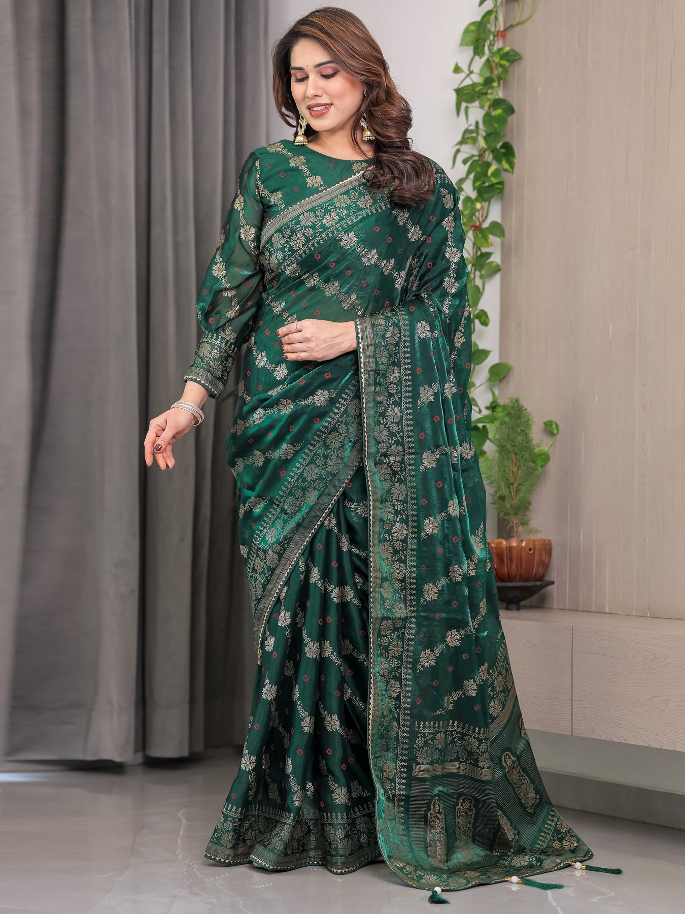 The deep green base is beautifully adorned with delicate floral and geometric motifs, enhanced by a finely detailed border and an artistically designed pallu. The fluid satin drape ensures a flattering fall, while the fabric remains lightweight and comfortable for extended wear.
