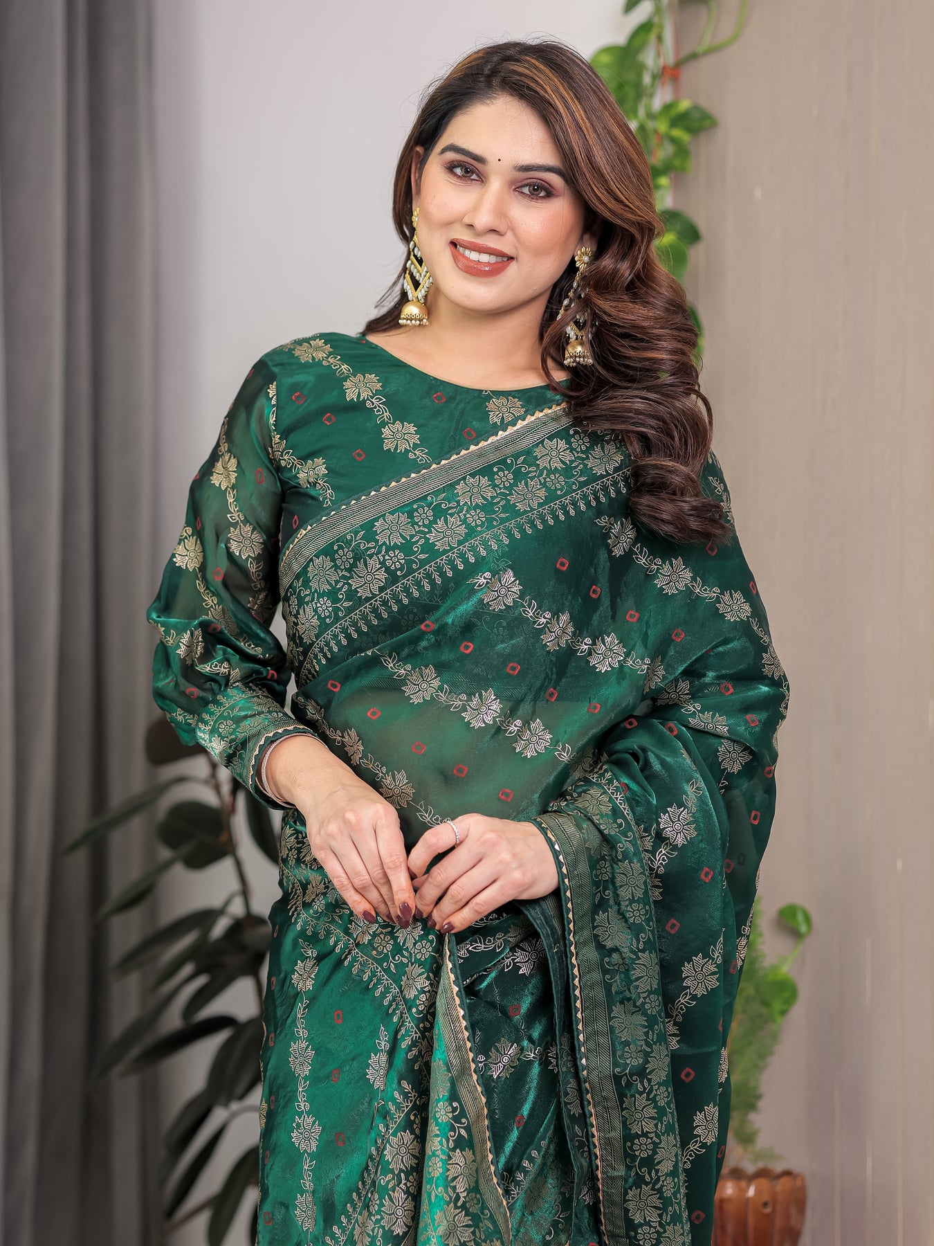 Emerald Green Fendi Satin Block & Foil Print Saree with Attached Blouse & Tassel Finish