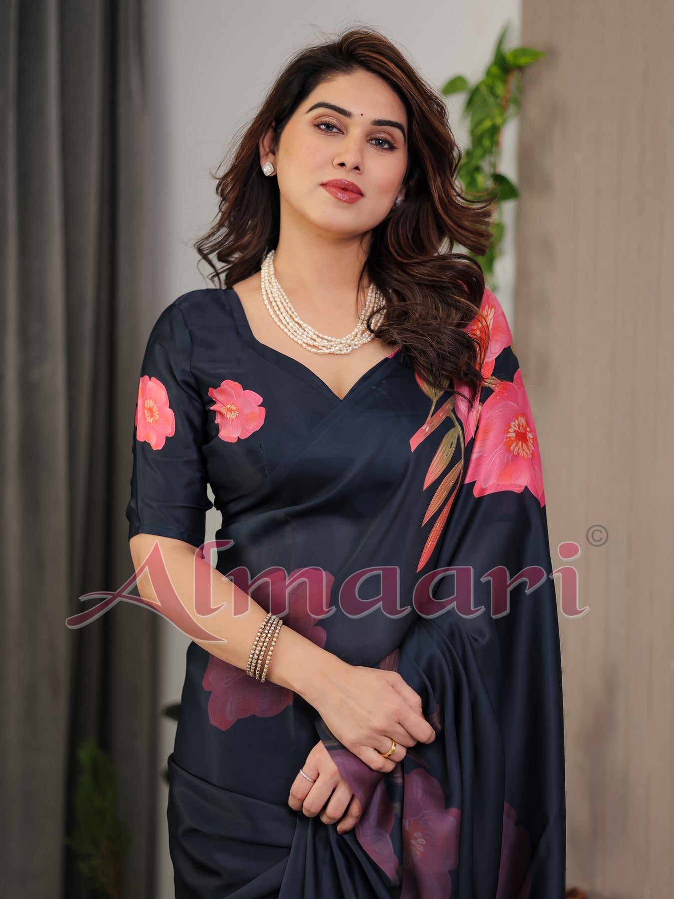 Crafted from premium satin georgette fabric, the saree features a rich navy blue base adorned with large rose-inspired floral prints in shades of coral pink and soft peach, complemented by delicate leaf detailing. The satin georgette texture lends a subtle sheen and graceful fall, creating a flattering drape that moves effortlessly with you.