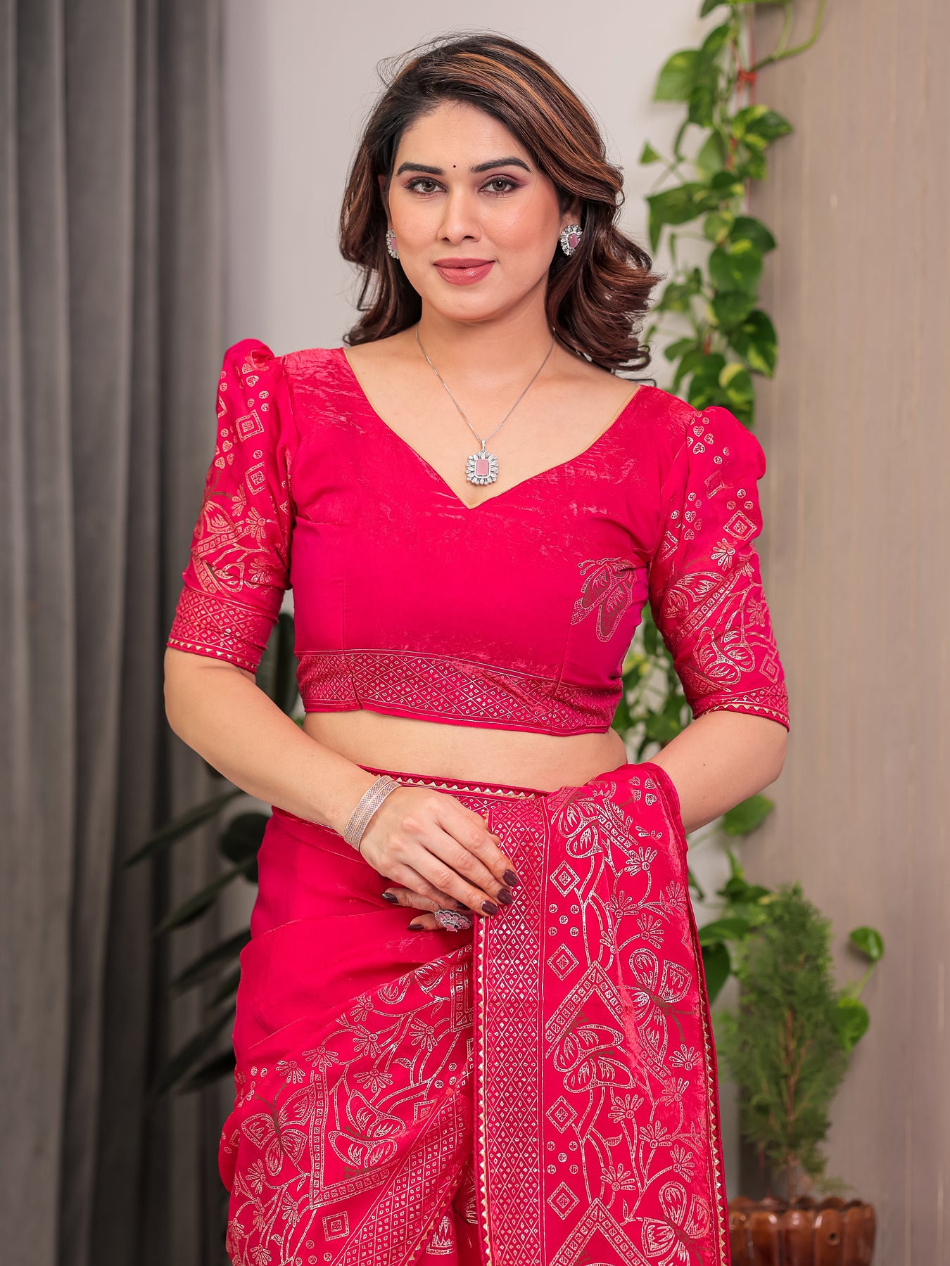 Make a bold and graceful statement with this Rani Pink Fendi Satin saree, crafted to celebrate timeless Indian elegance with a modern touch. Made from luxurious Fendi satin fabric, this saree features intricate block printing enriched with delicate foil accents, giving it a rich festive sheen and refined appeal.