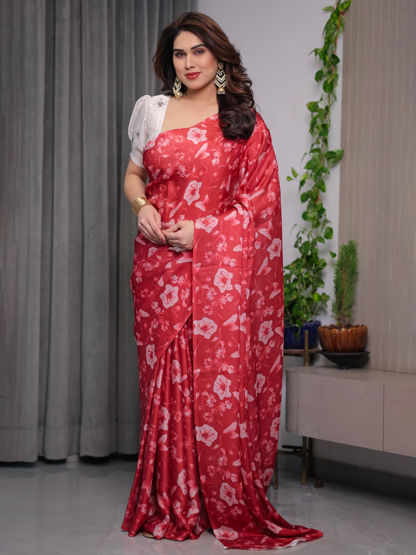 Red Satin Georgette Floral Printed Saree with Attached Blouse – Elegant Soft-Flow Designer Saree for Parties & Festive Wear