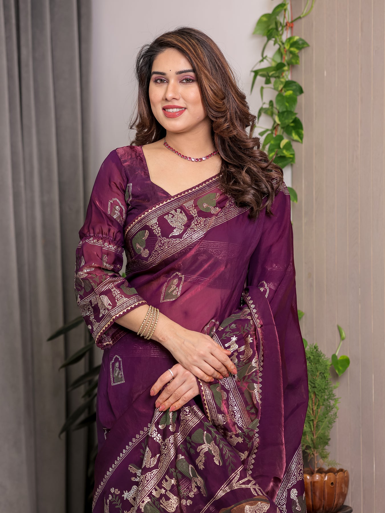 Ideal for weddings, festive celebrations, poojas, cultural gatherings, and evening occasions, this wine purple Fendi satin saree is designed for women who appreciate rich colors, traditional motifs, and premium quality in their ethnic wardrobe.