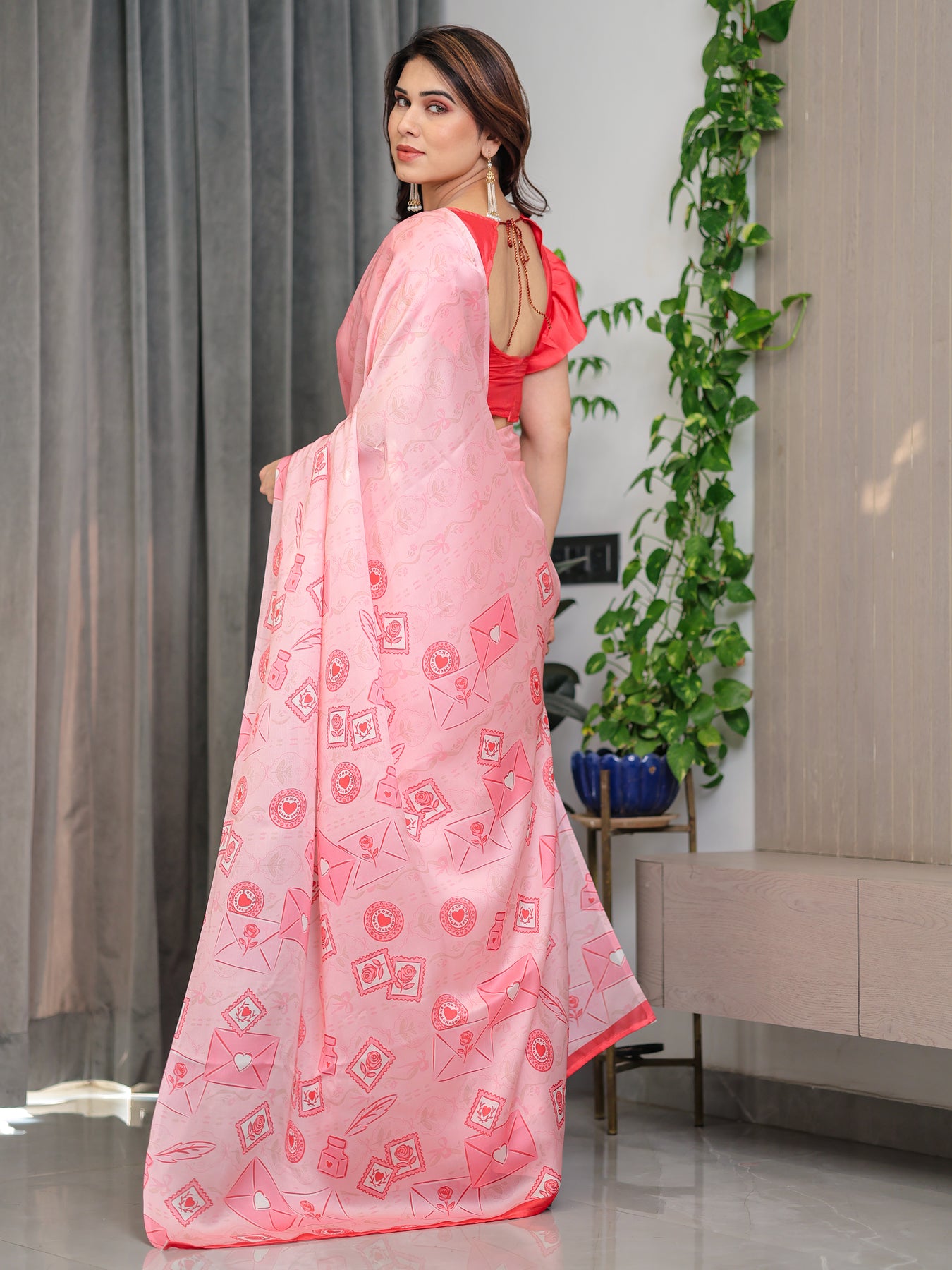The saree features a soft baby pink base, enhanced with a romantic love-letter theme print. The body showcases artistic motifs such as:
