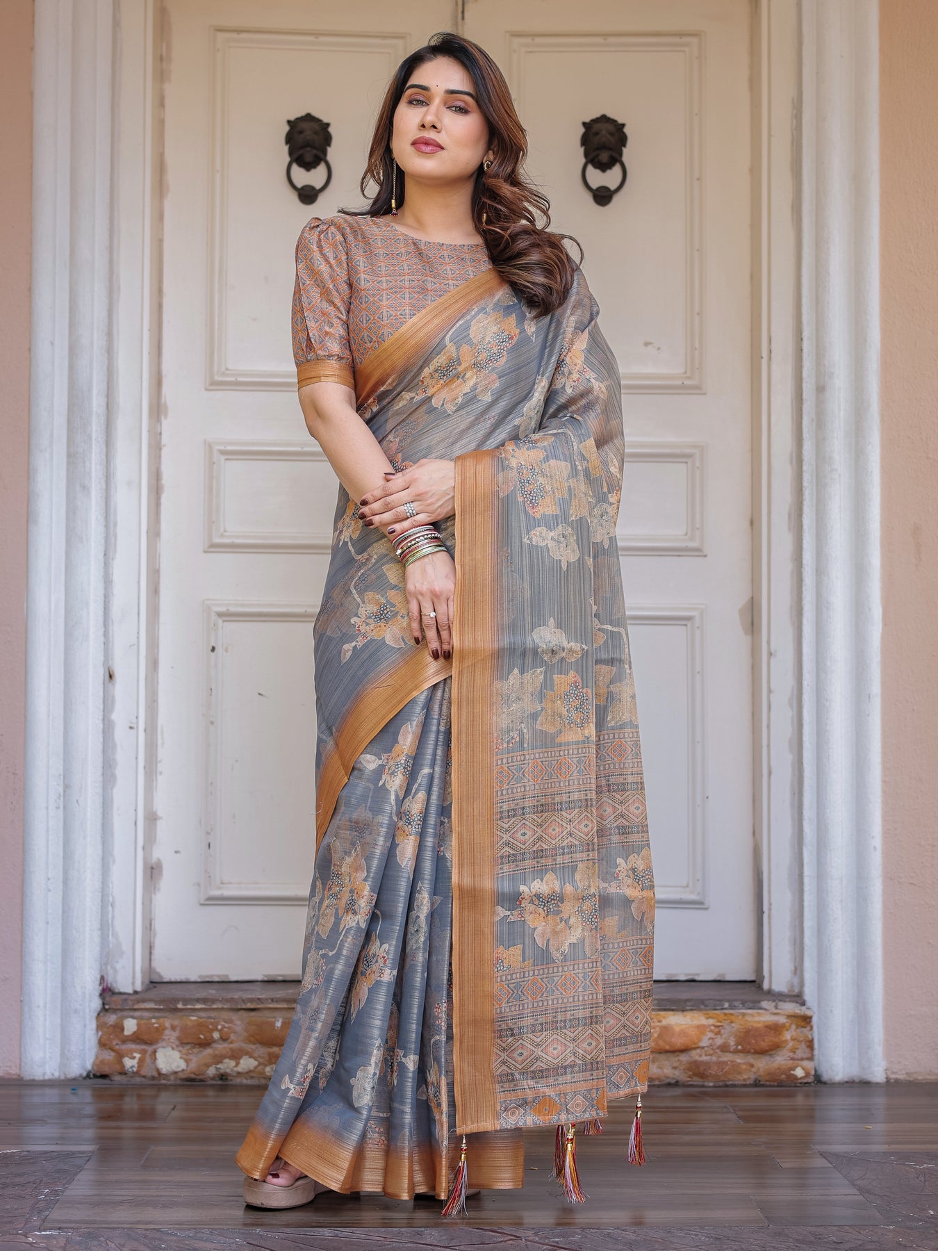 Steel Grey & Rust Gold Floral Handloom Cotton-Linen Saree with Zari Border & Tassels – Elegant Traditional Wear