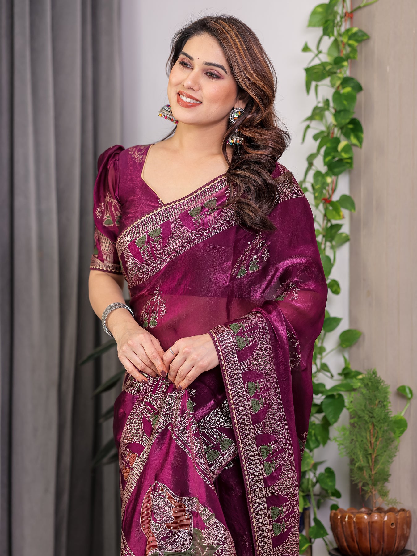 Pair with antique gold, kundan, or oxidised jewellery to complement the richness of the wine tone.