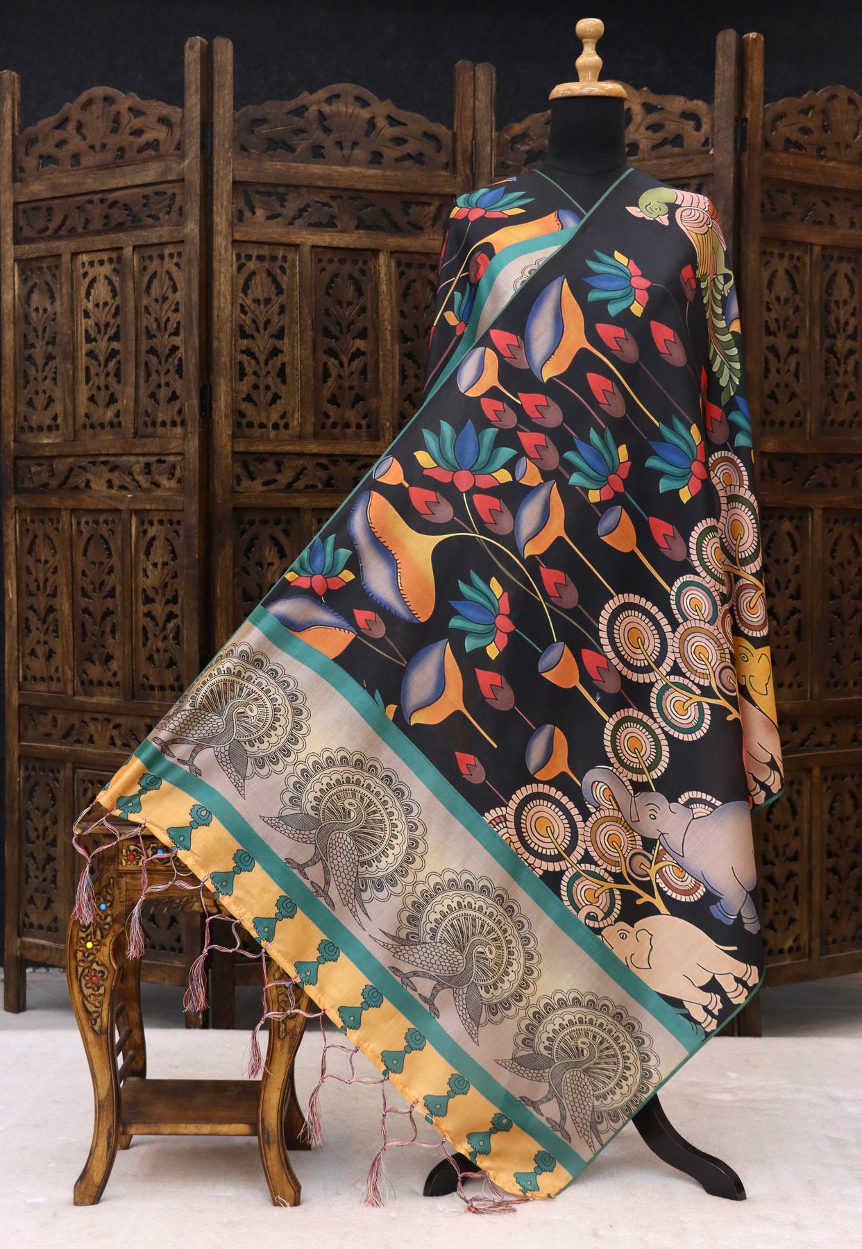 Design: Abstract floral body with peacock & elephant folk border