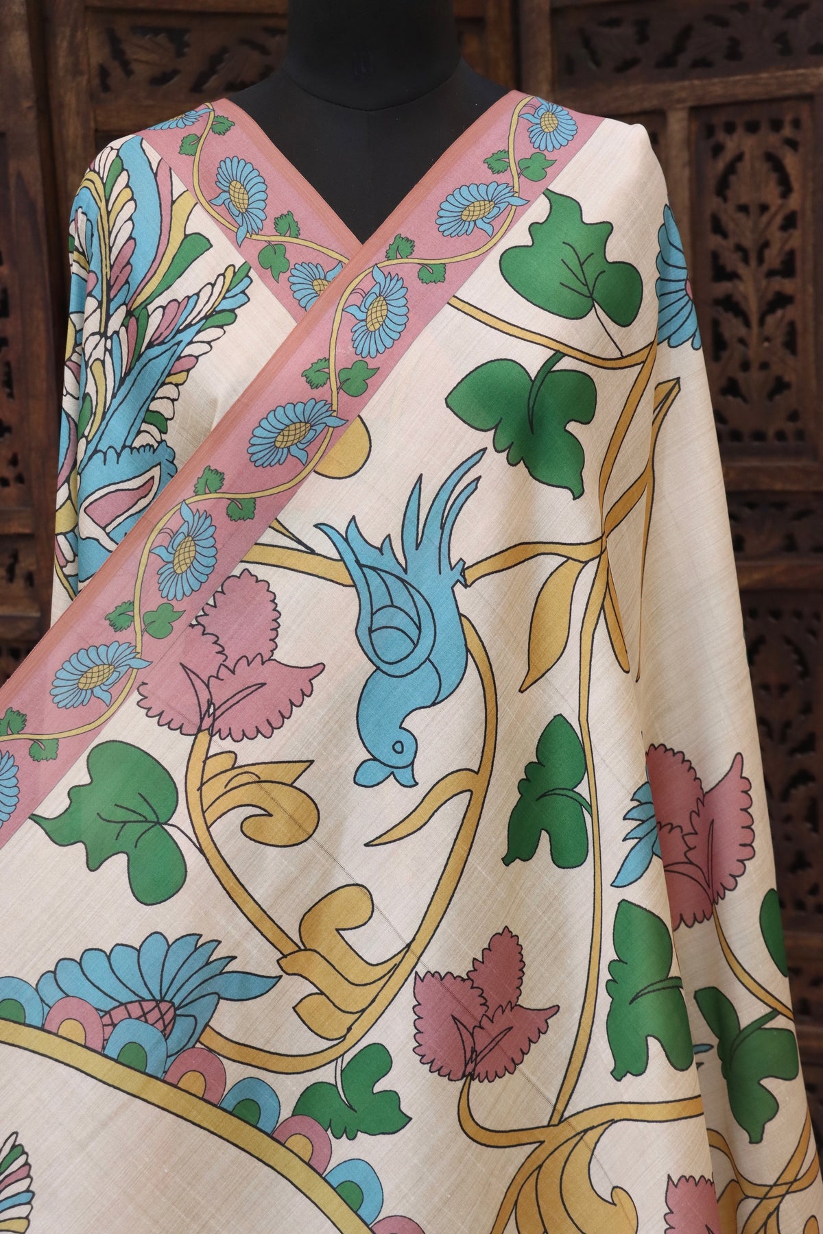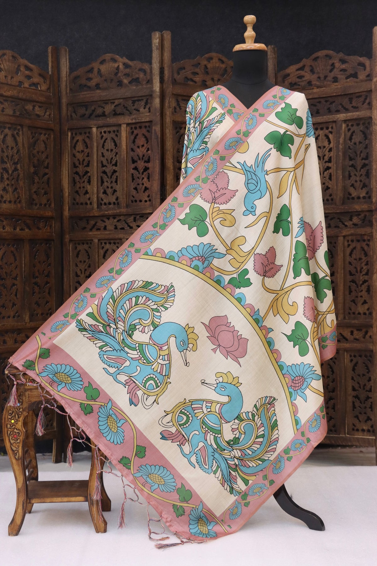Ivory & Pastel Pink Malai Silk Dupatta with Peacock Motif Panel, Floral Vine Print & Contrast Border with Tassels