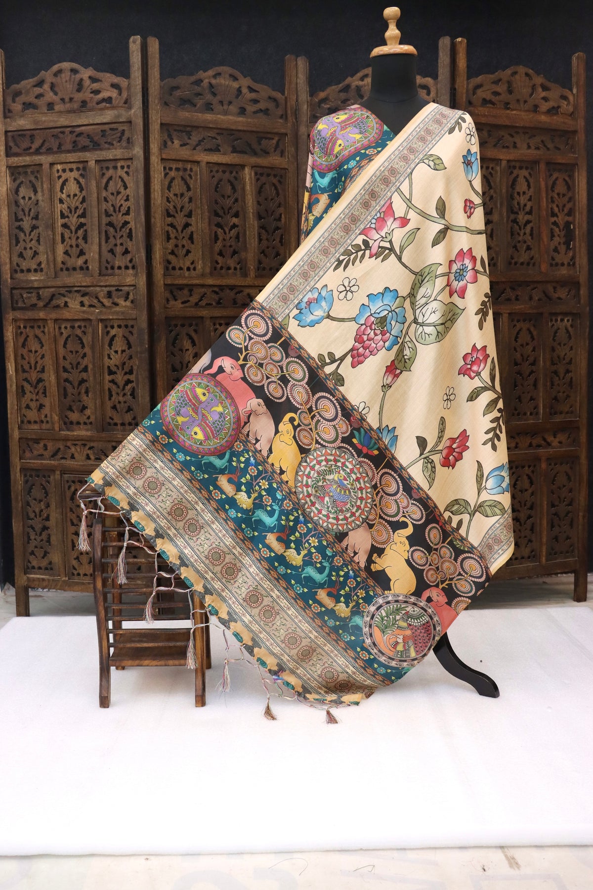 Made from premium Malai silk, the dupatta is luxuriously soft, lightweight, and fluid, offering effortless drape and comfort throughout the day. Its harmonious mix of delicate florals and expressive folk art makes it a standout accessory for women who love distinctive ethnic styling.