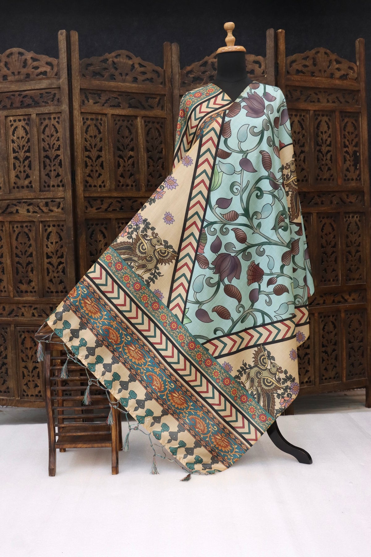 What sets this dupatta apart is its striking multi-pattern border, showcasing zigzag chevron lines, ornamental floral panels, and Kalamkari-inspired owl motifs symbolizing wisdom and heritage. The harmonious contrast of beige, teal, and earthy accents gives the dupatta a rich, layered look, while the hand-tied tassels add a refined artisanal finish.