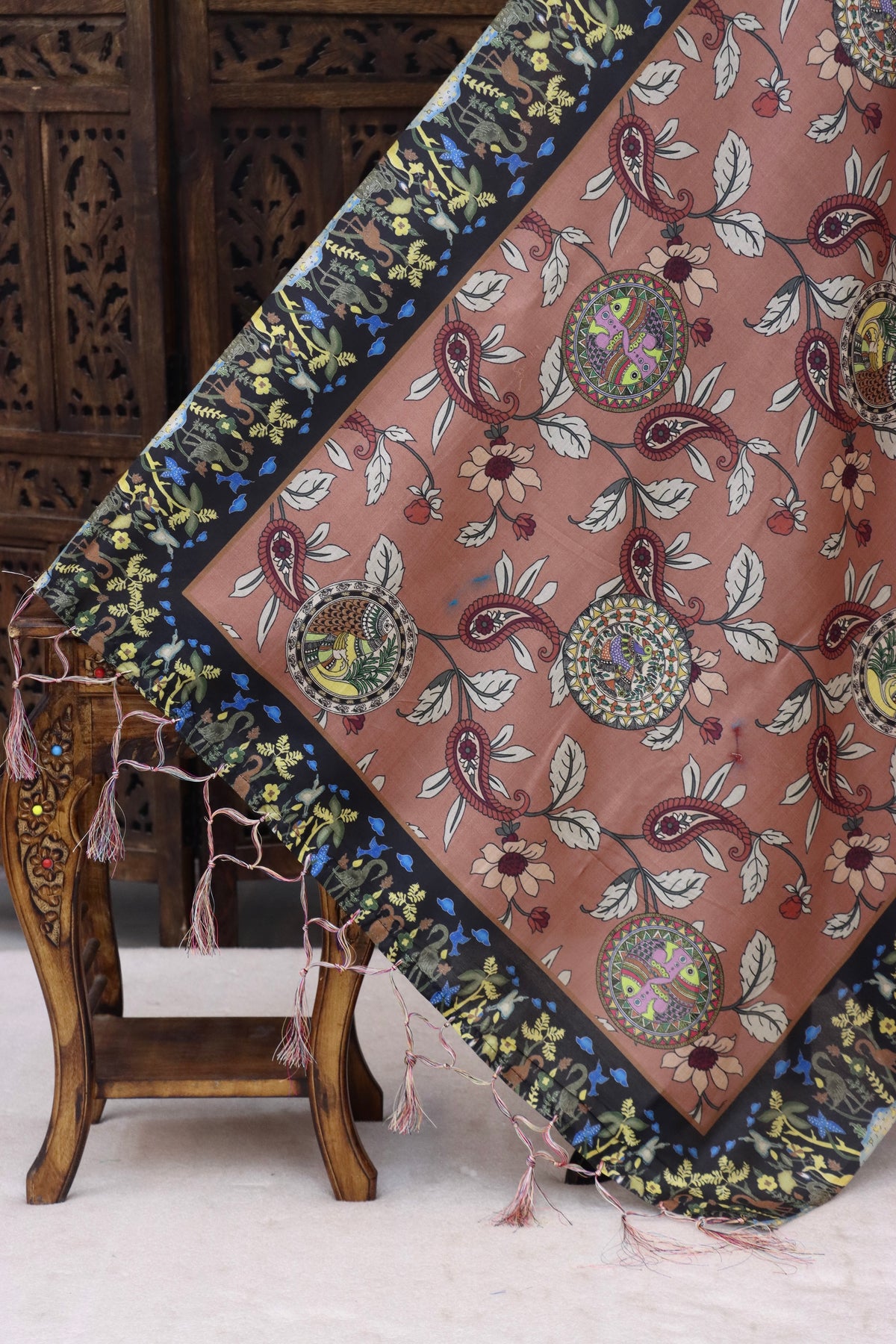 Rust Brown Malai Silk Dupatta with Paisley Floral Print, Folk Medallion Motifs & Contrast Botanical Border with Tassels