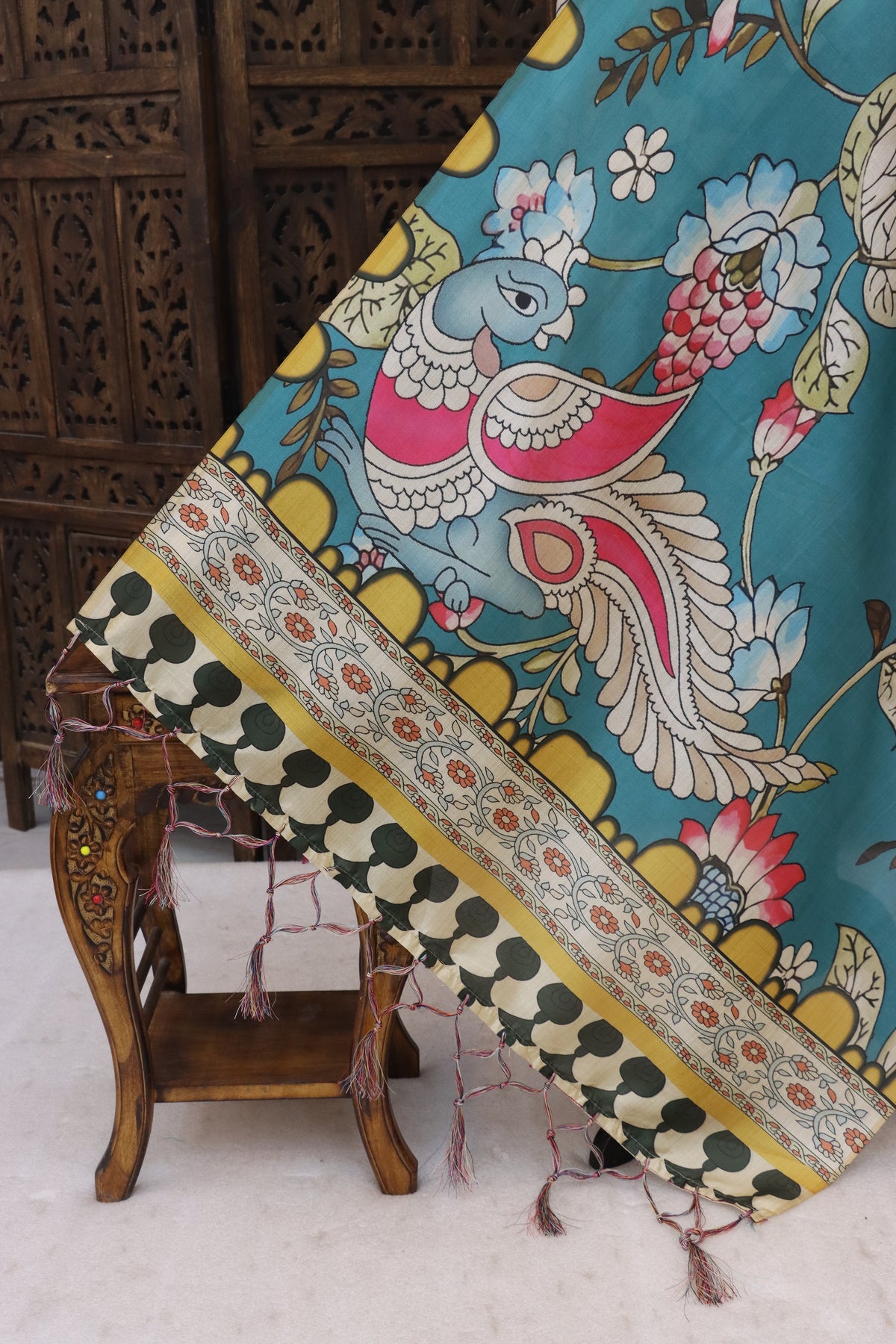 Elevate your ethnic styling with this exquisitely designed Malai Silk Printed Dupatta, crafted to reflect timeless elegance and artistic charm. Set on a rich teal blue base, the dupatta features a beautifully illustrated peacock motif, surrounded by delicate floral vines and blooming flowers in soft shades of pink, ivory, mustard, and green.