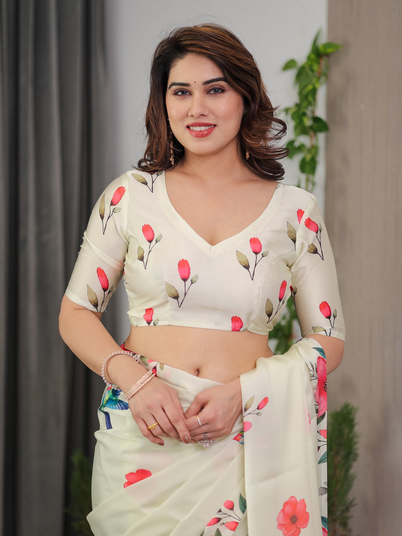 Ivory Cream Satin Georgette Floral & Bird Printed Saree with Attached Blouse – Elegant Nature-Inspired Designer Saree