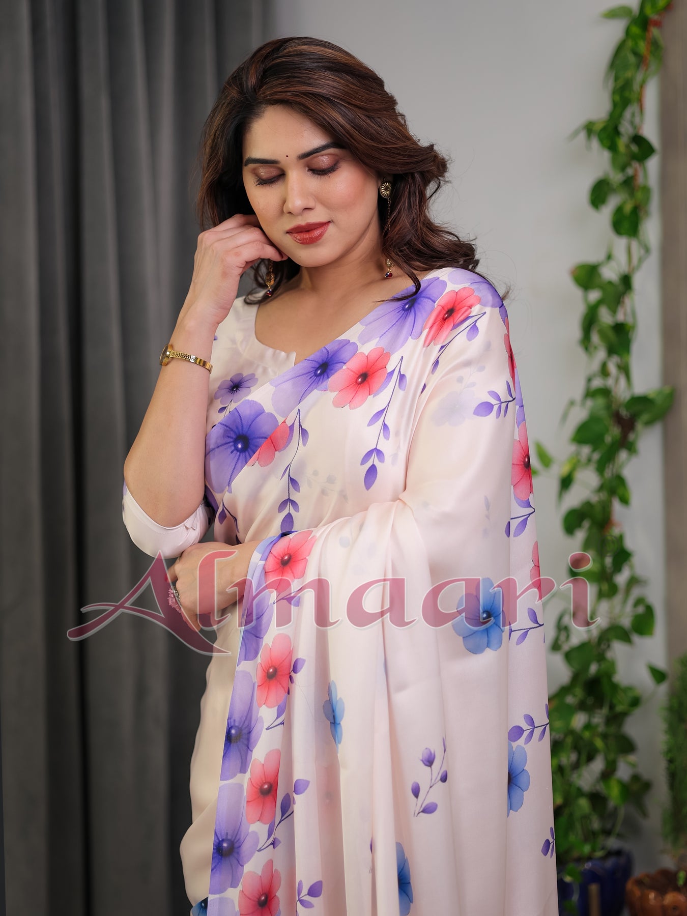 Cream Satin Georgette Multicolor Floral Printed Saree with Attached Blouse – Soft Pastel Designer Saree for Festive & Elegant Wear
