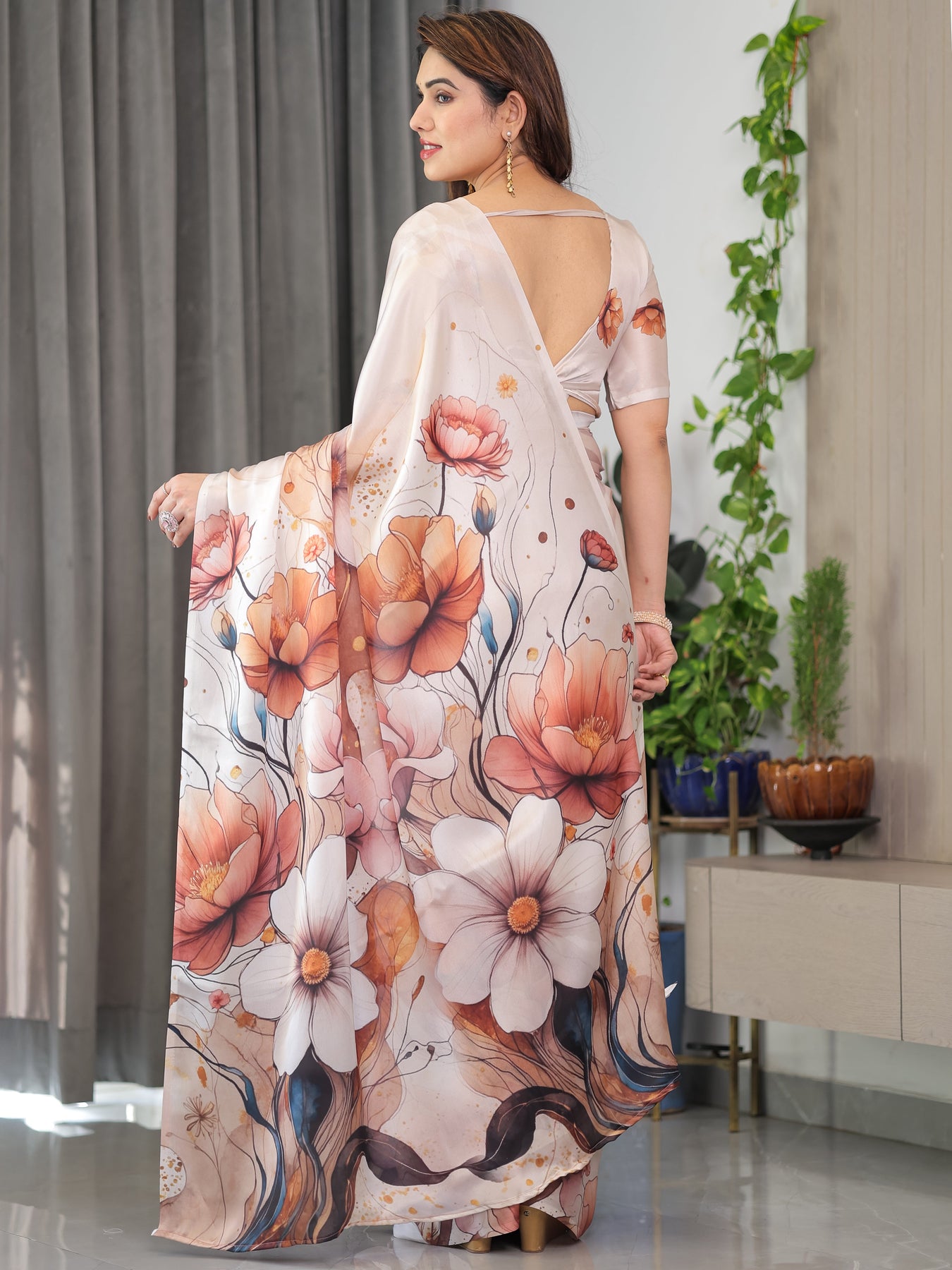 Ivory Beige Satin Georgette Abstract Floral Printed Saree with Attached Blouse – Elegant Designer Saree for Festive & Sophisticated Wear