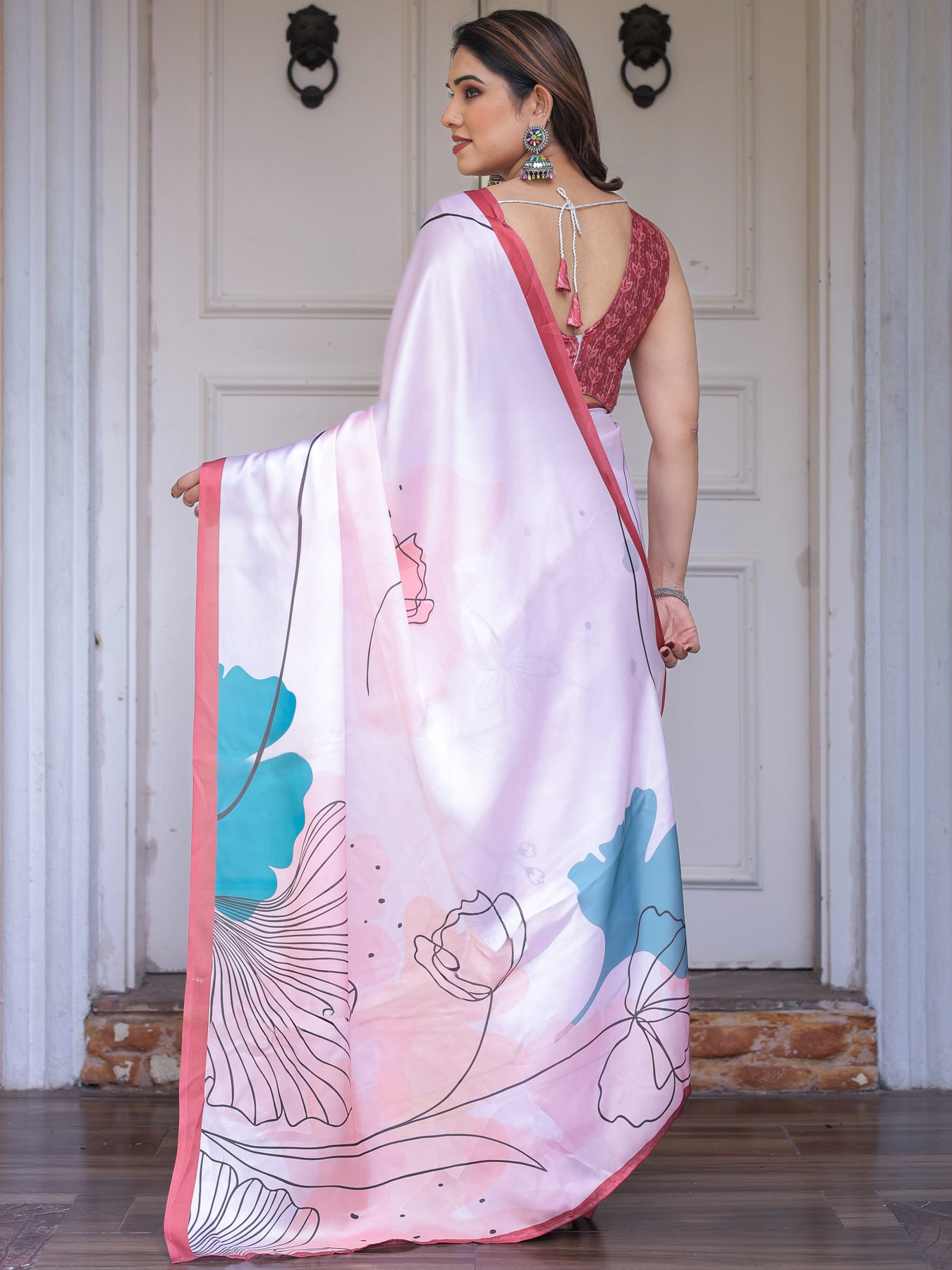 Add a touch of artistic sophistication to your wardrobe with this pastel pink satin georgette printed saree, crafted for women who appreciate modern minimal aesthetics with soft feminine charm. The soothing pastel base is highlighted with abstract floral line art and soft teal accents, finished with a contrast coral border that enhances the drape beautifully.