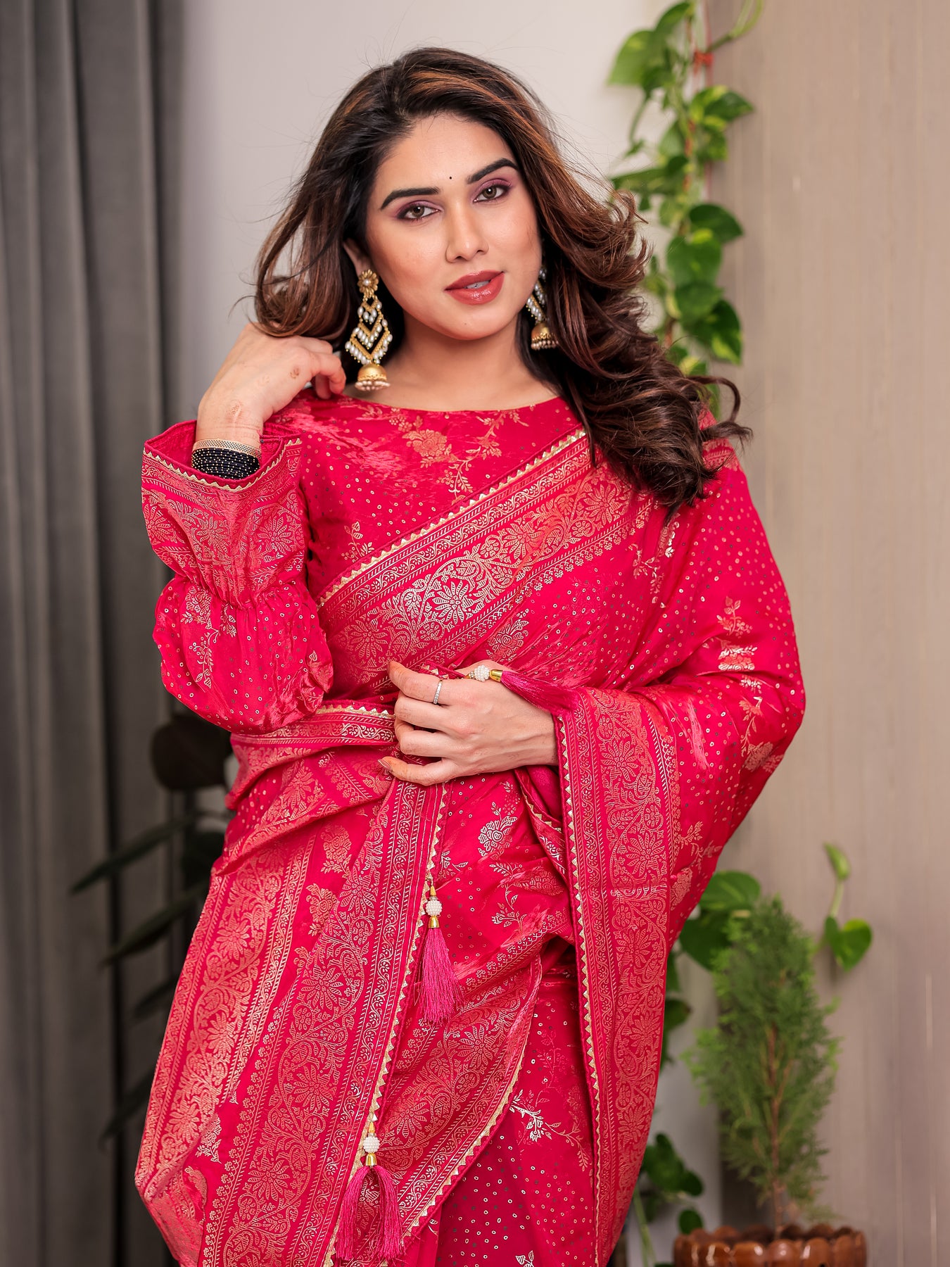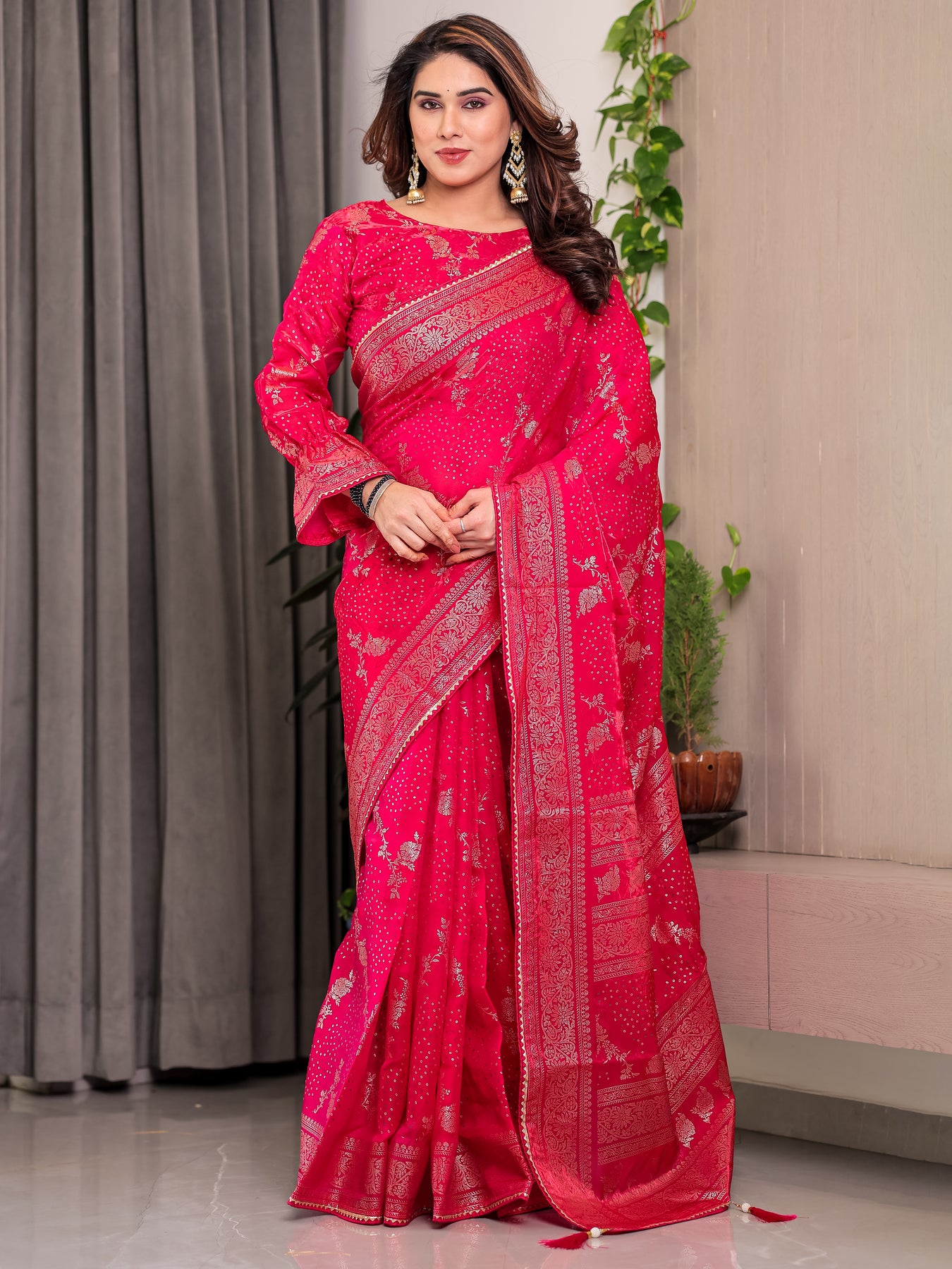 Rani Pink Fendi Satin Floral Block & Foil Printed Saree with Ornamental Border, Tassel Edges & Attached Blouse