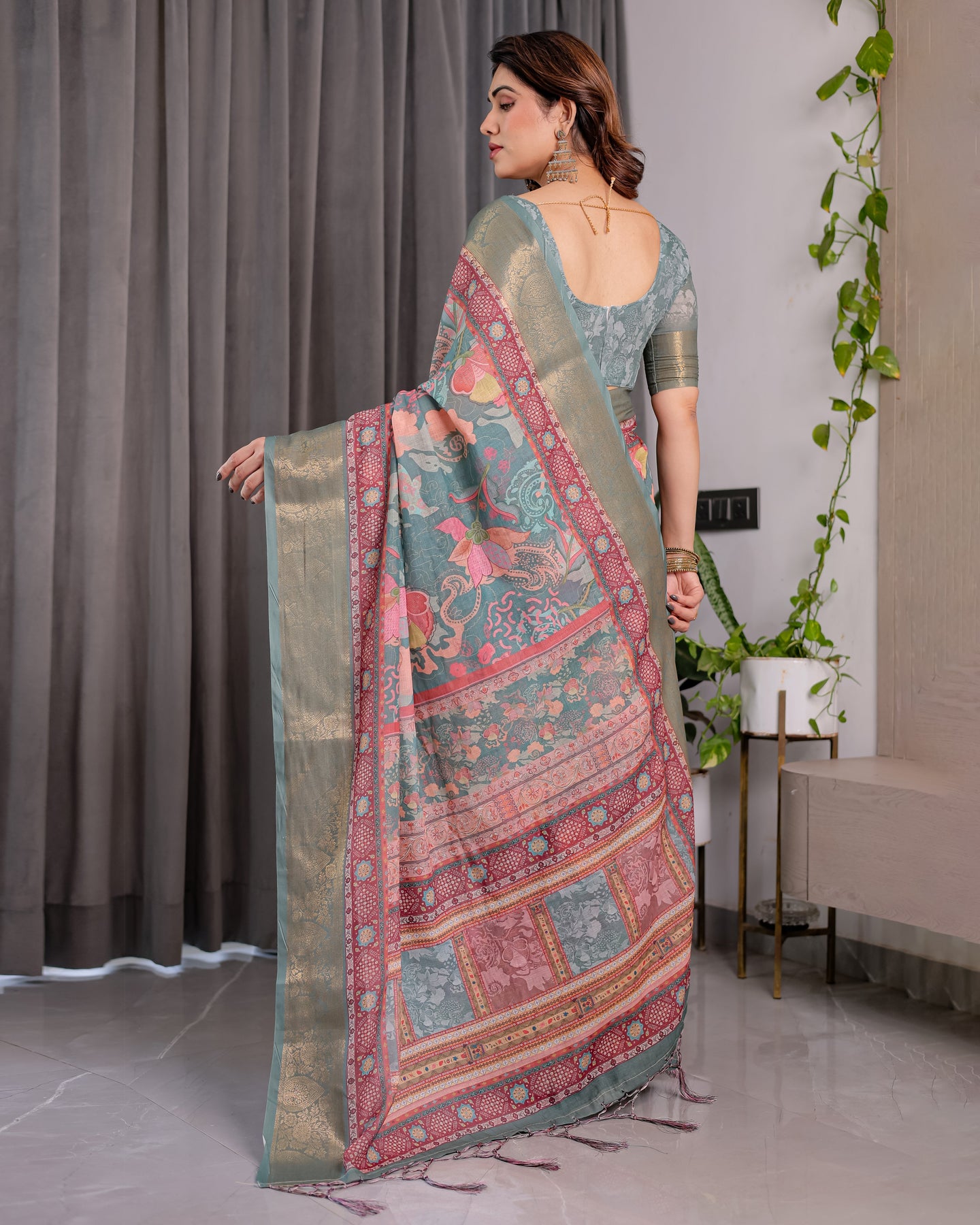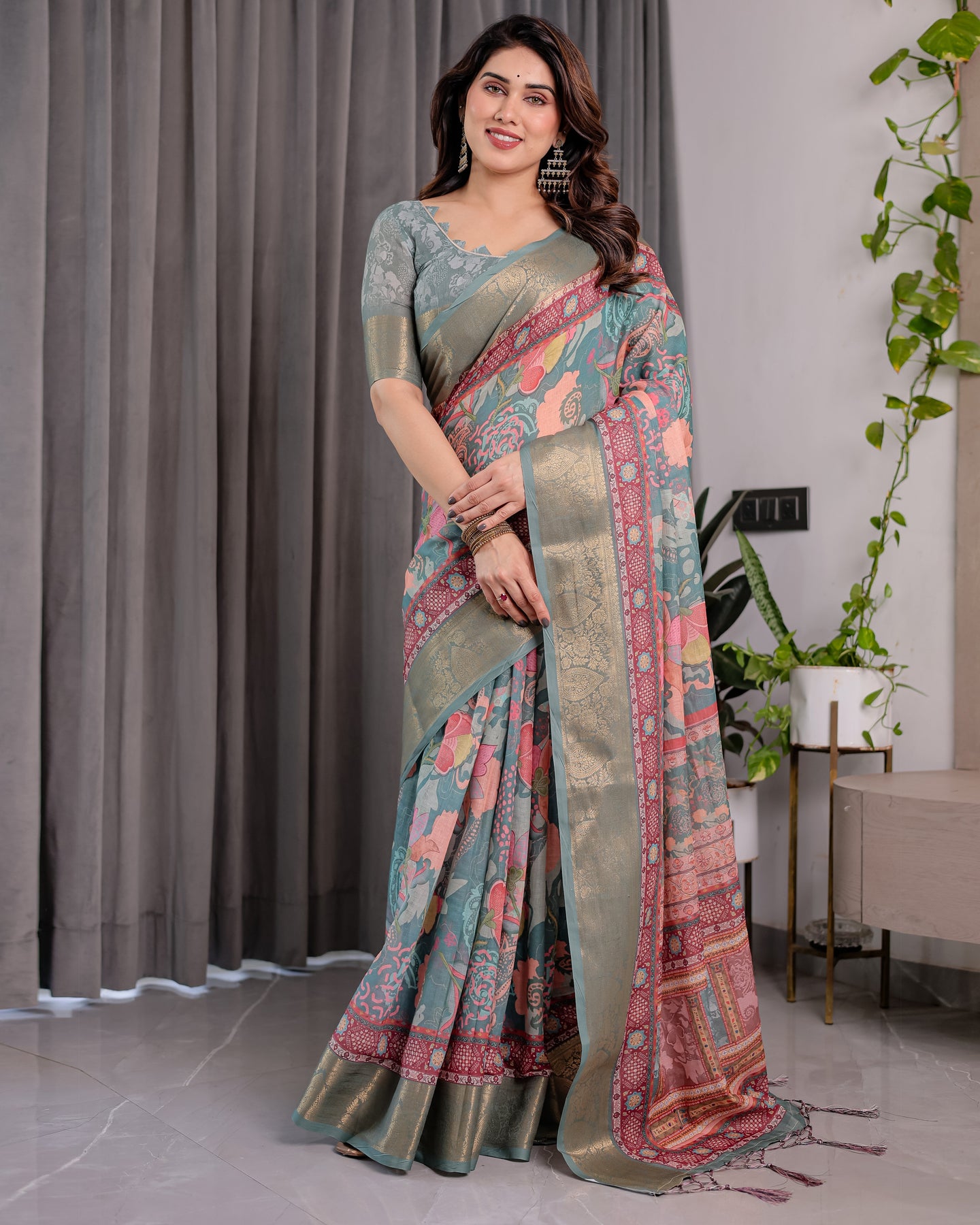 A matching 0.8 meter unstitched blouse piece in coordinated sage green completes the ensemble with elegance and ease of styling.