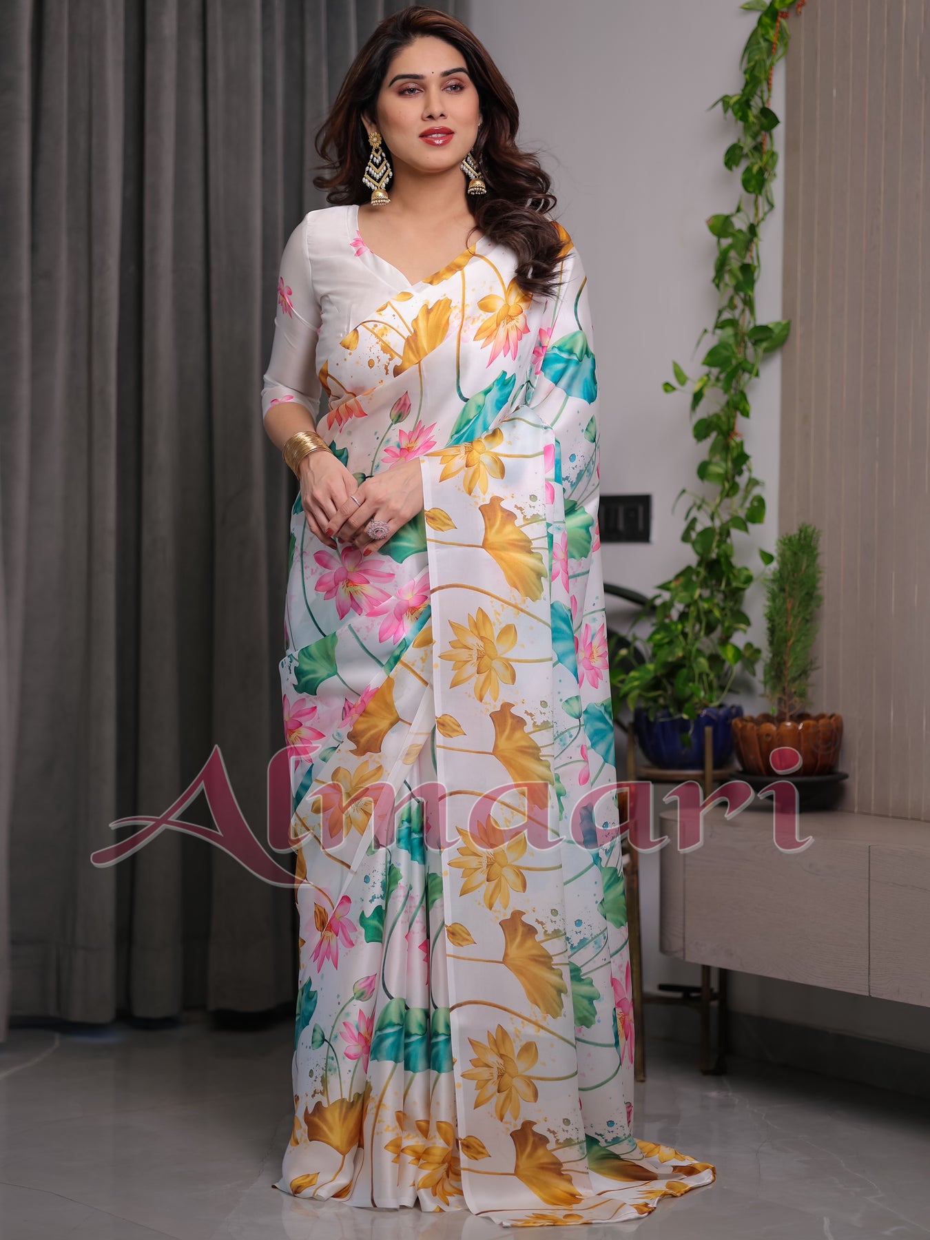 White Satin Georgette Lotus Floral Printed Saree with Attached Blouse – Elegant Watercolor Designer Saree for Festive & Graceful Occasions